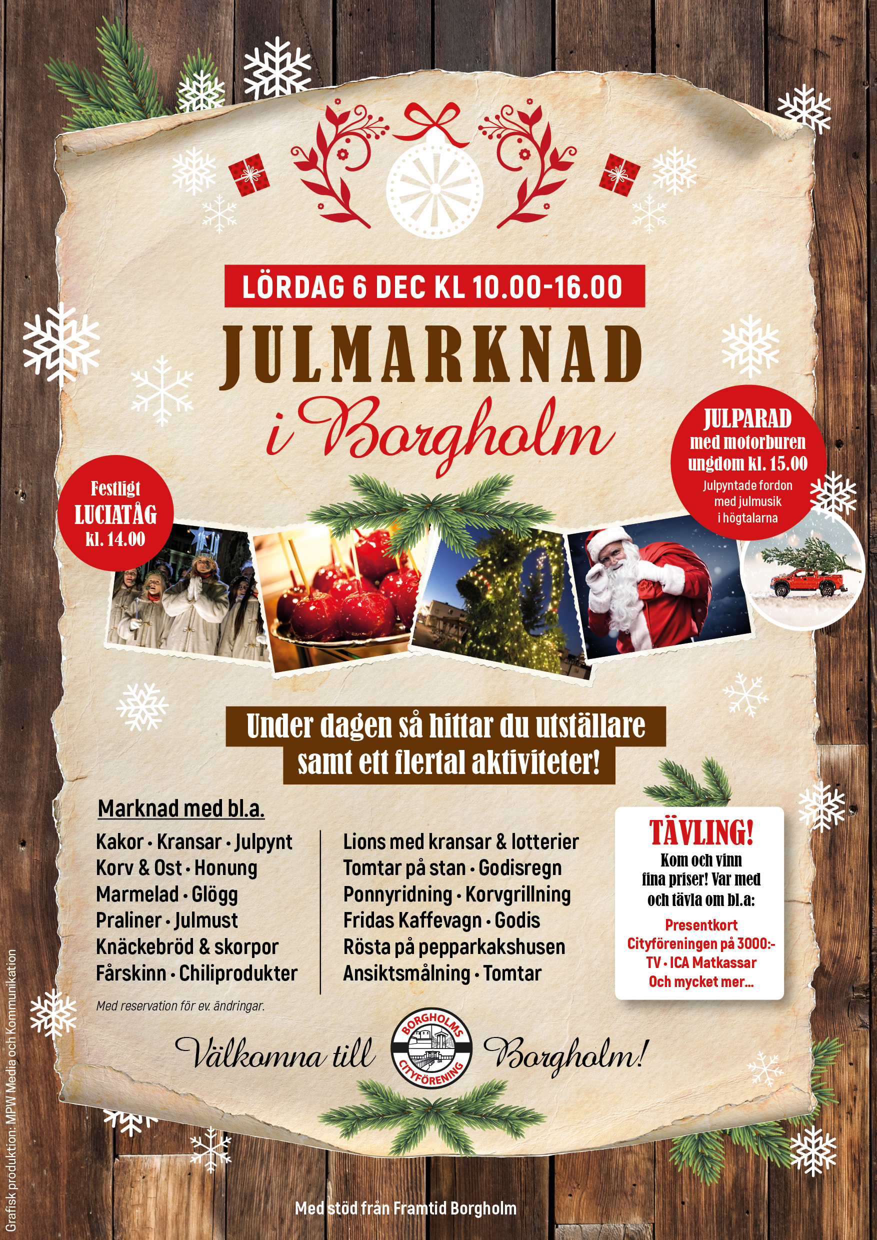 Utställare som säljer kakor, kransar, julpynt, korv & ost, honung, marmelad, glögg, praliner, knäckebröd o skorpor, fårskinn, ost, julbockar, hantverk, valnötter, tomtar, chiliprodukter, julpynt med mera!